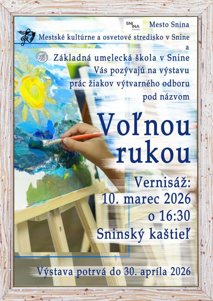 Srdečne vás pozývame na vernisáž výstavy prác žiakov výtvarného odboru Základná umelecká škola v Snine, ktorá sa uskutoční 10. marca 2026 o 16:30 hod. v kaštieli v Snine