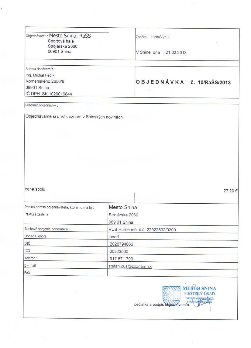 - Mesto Snina, Strojárska 2060, RO Rybníky, 06901 Snina