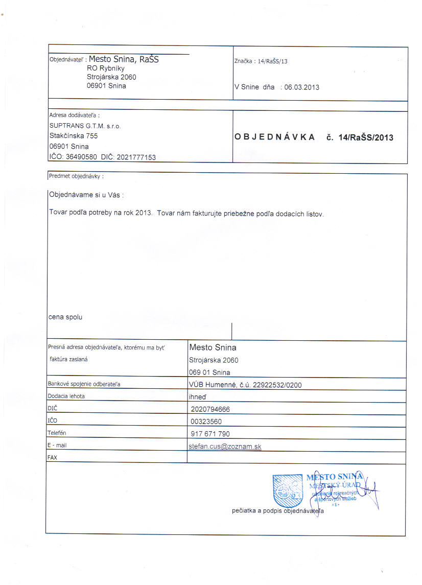 - Ku zmluve č.: 14-RaŠS-13 Celoročná objednávka na nákup tovaru