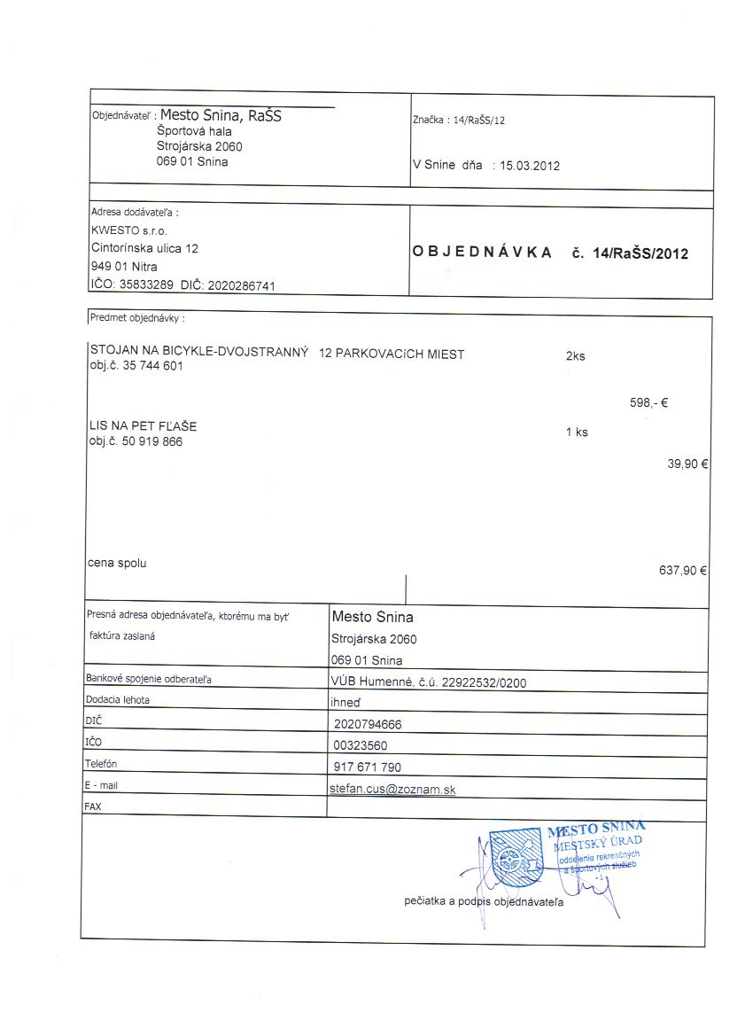 - Ku zmluve č.: 14-RaŠS-2012 stojany na bicykle, lis na pet fľaše