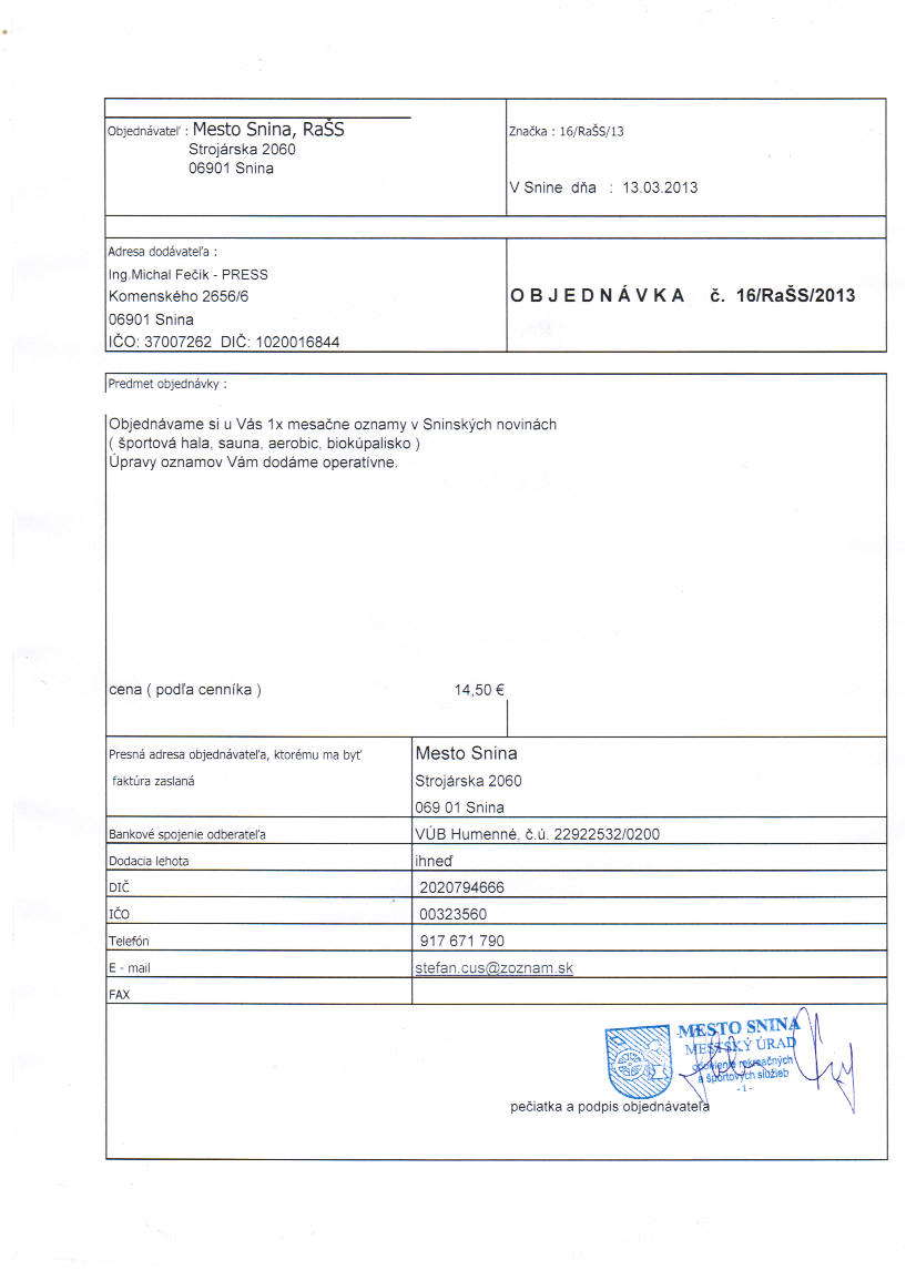 - Ku zmluve č.: 16-RaŠS-13 Mesačné oznamy v sninských novinách