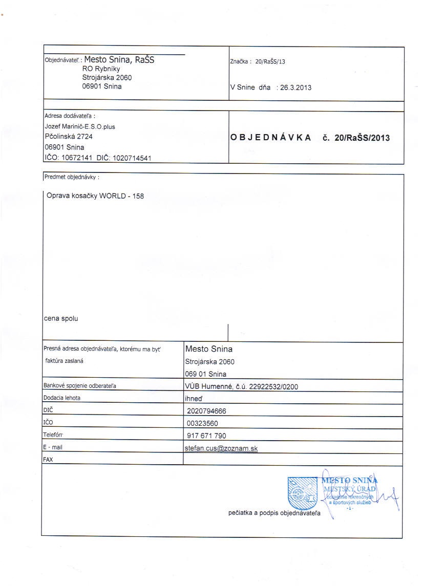 - Ku zmluve č.: 20-RaŠS-13 Oprava kosačky WORLD 158