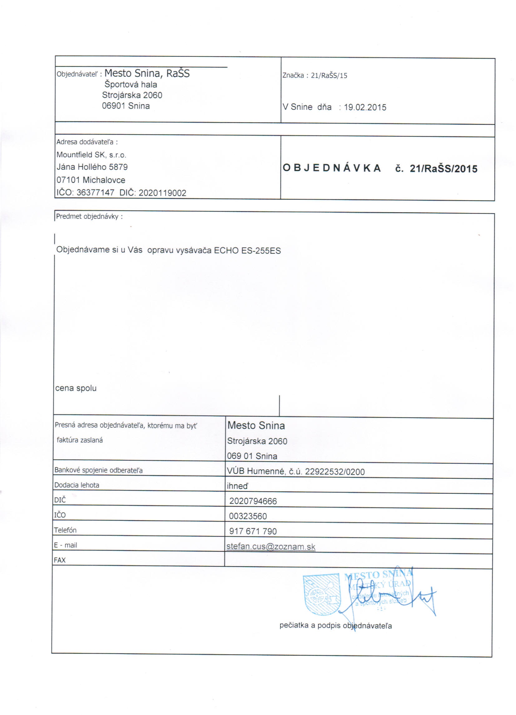 - Ku zmluve č.: 21-RaŠS-2015 Oprava vysávača ECHO ES-255ES