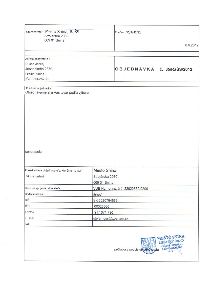 - Ku zmluve č.: 35-RaŠS-2012 tovar podľa výberu