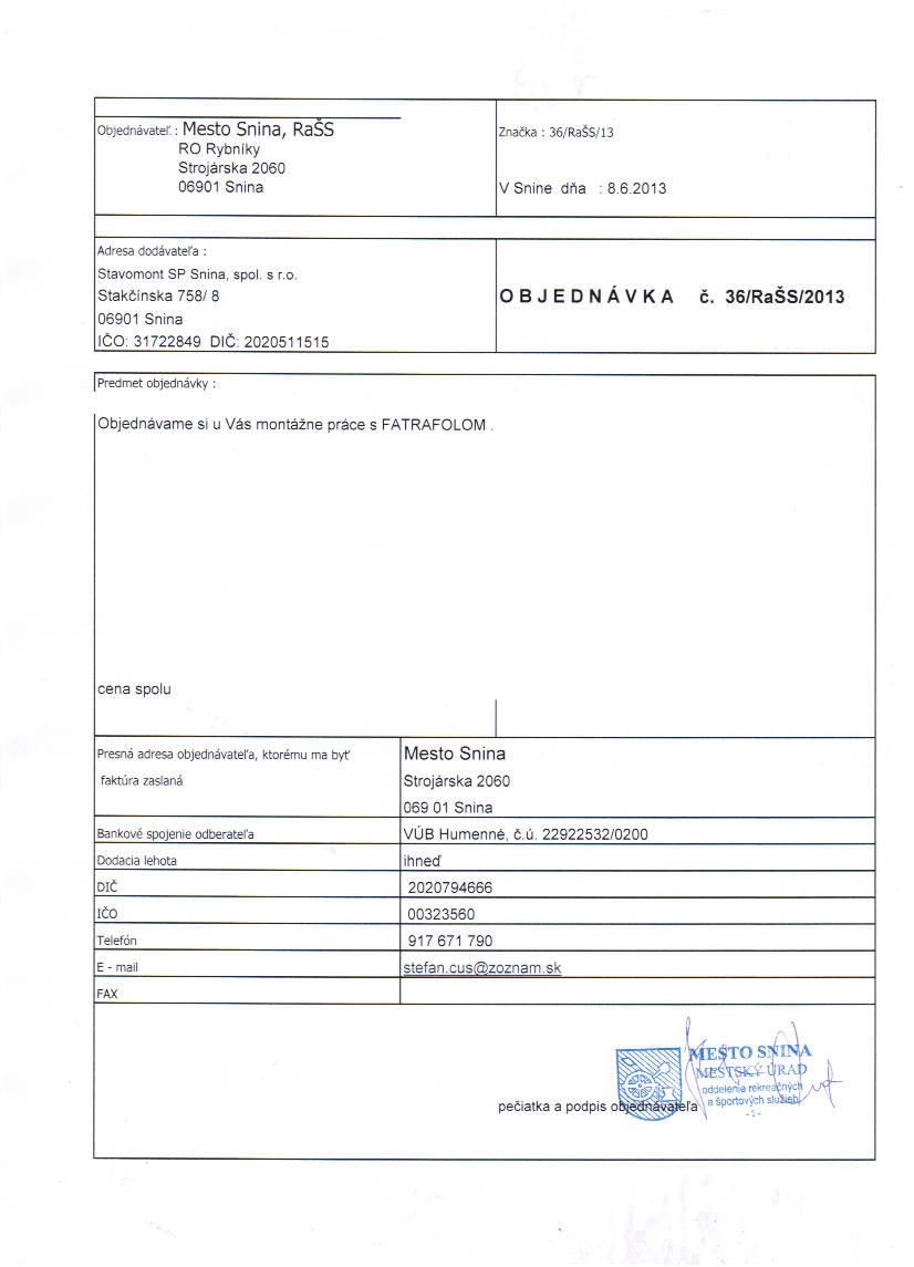 - Ku zmluve č.: 36-RaŠS-13 Montážne práce s FATRAFOLOM