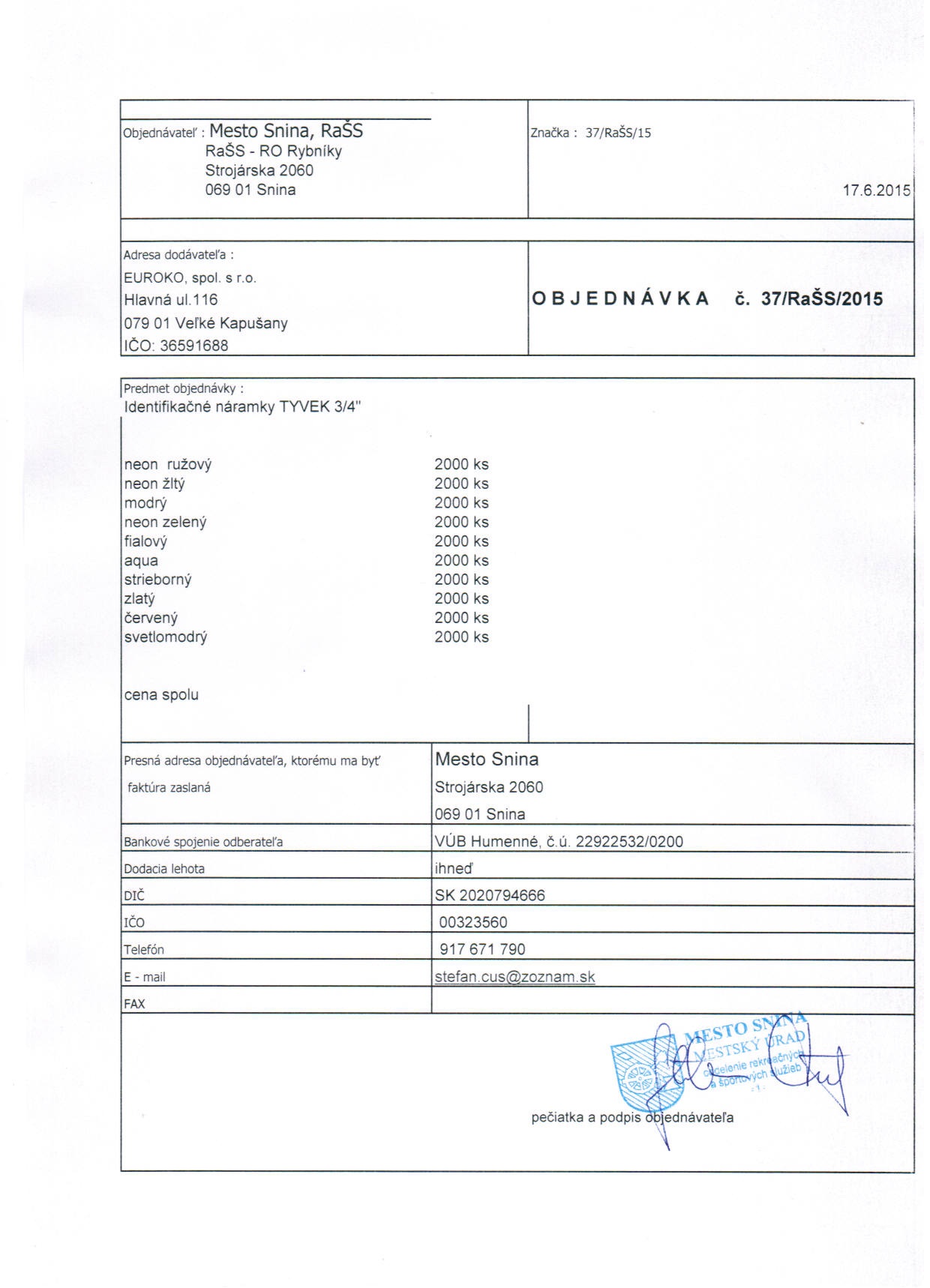 - Ku zmluve č.: 37-RaŠS-2015 Identifikačné náramky - 20 000 ks