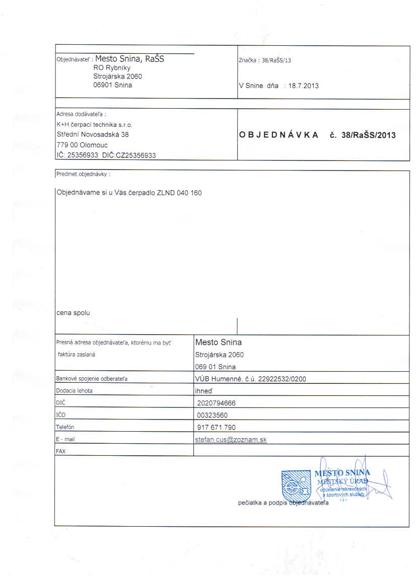 - Ku zmluve č.: 38-RaŠS-13 čerpadlo ZLND 040 160