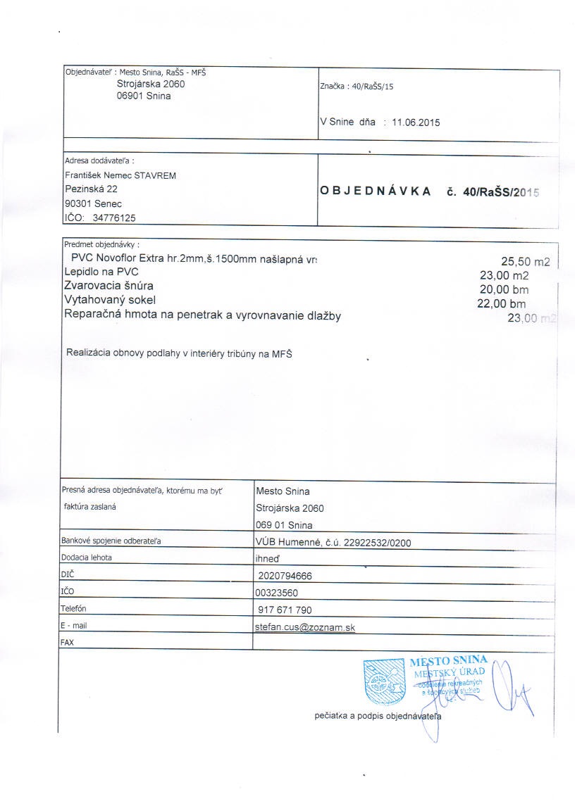 - Materiály na rekonštrukciu vnútorných priestorov tribúny