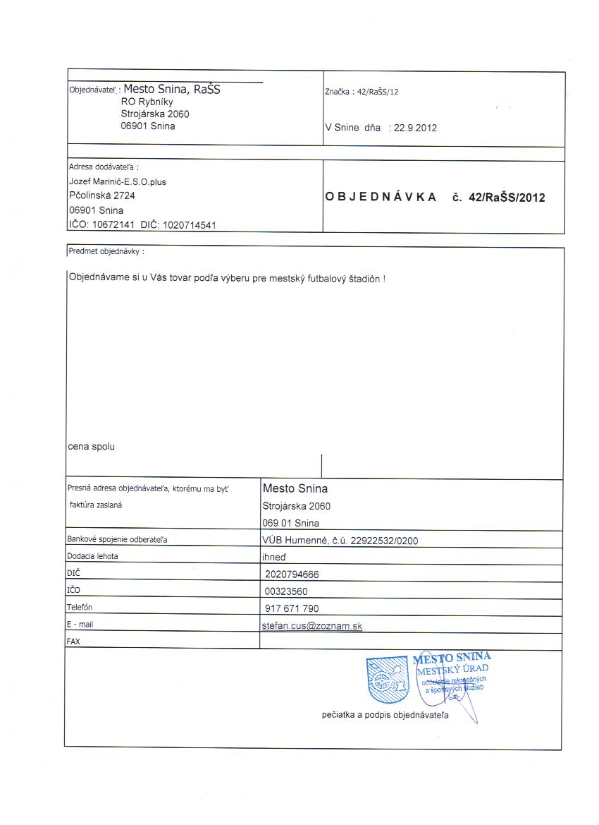 - Ku zmluve č.: 42-RaŠS-12 tovar podľa výberu