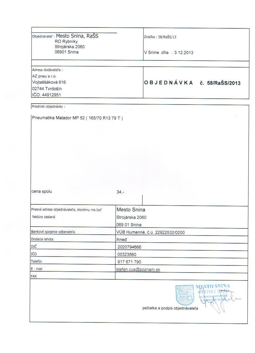 - Ku zmluve č.: 58-RaŠS-13 pneumatika MATADOR MP 52