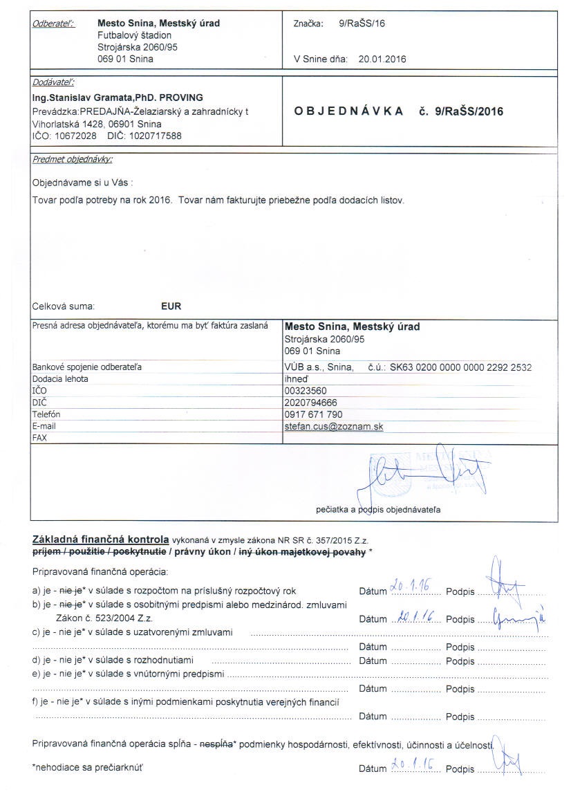 - Ing. Stanislav Gramata, PhDr. PROVING, Vihorlatská 1428, 069 01 Snina