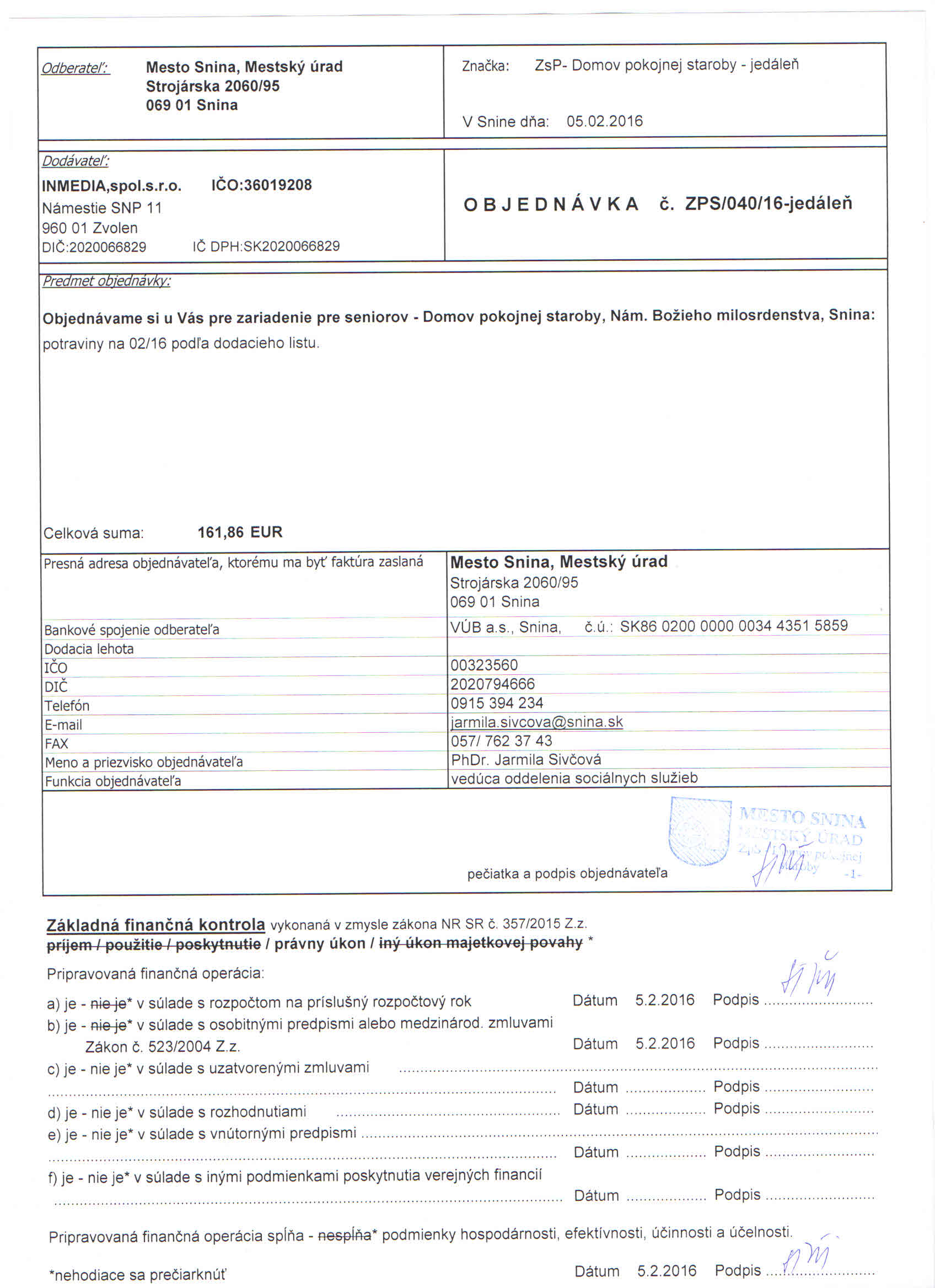 Detail objednávky ZPS/040/16-jedáleň