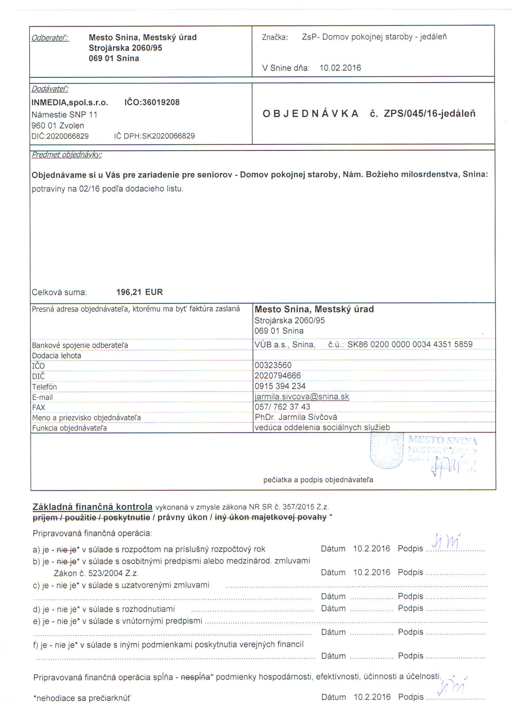 Detail objednávky ZPS/045/16-jedáleň
