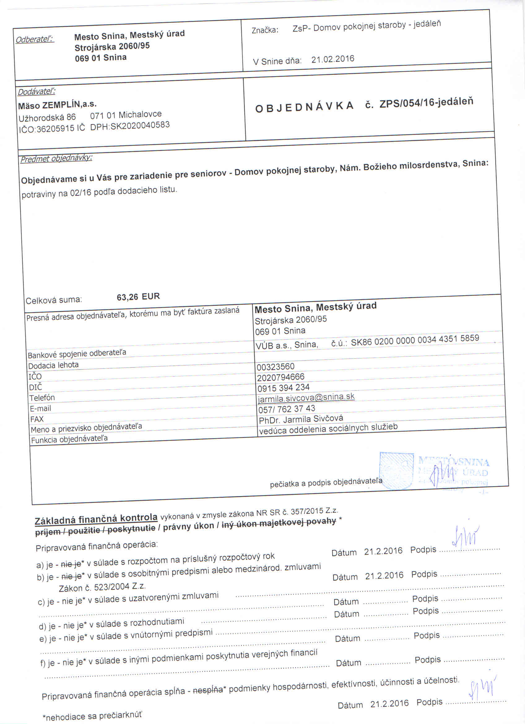 Detail objednávky ZPS/054/16-jedáleň