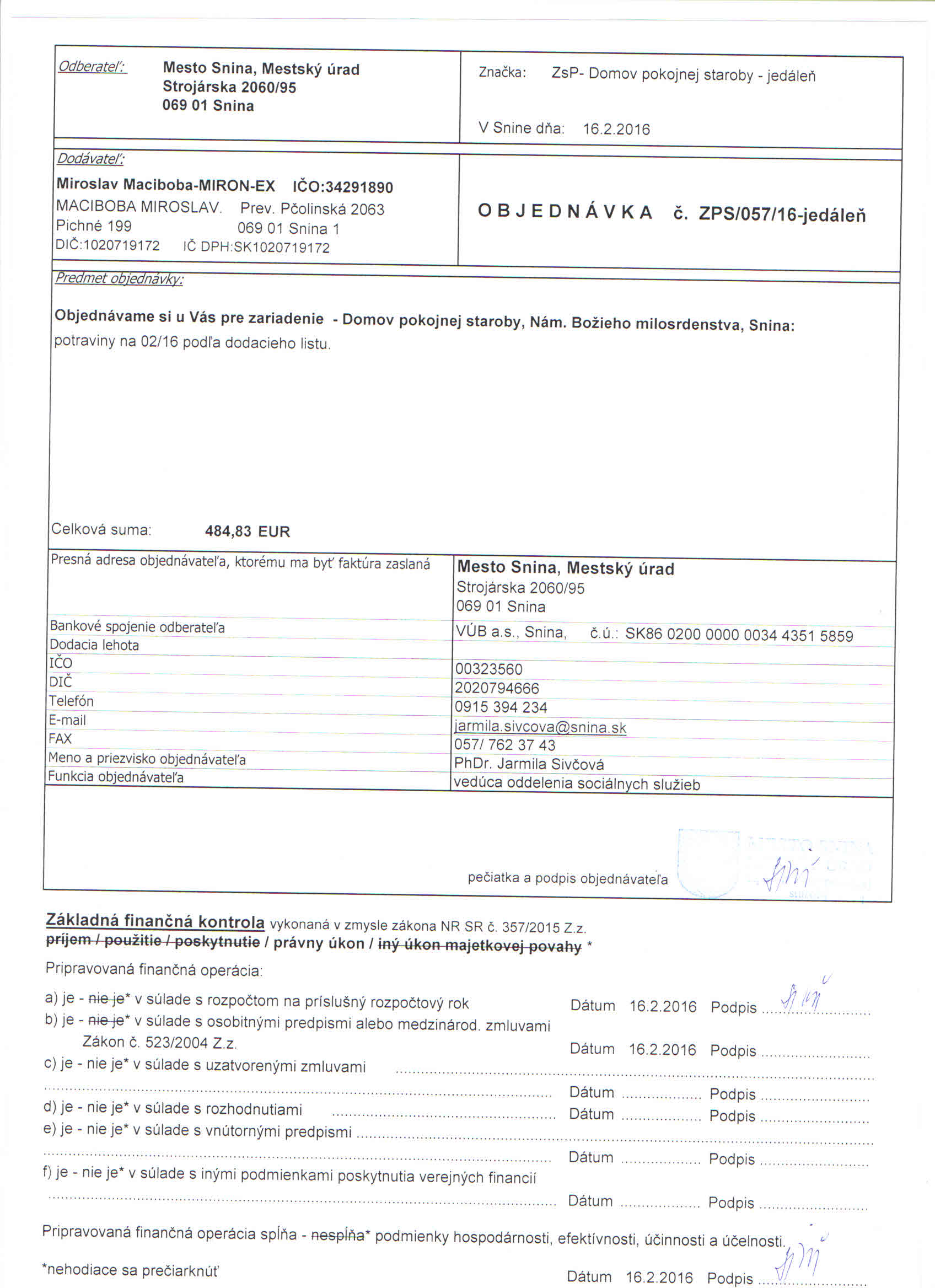 Detail objednávky ZPS/057/16-jedáleň