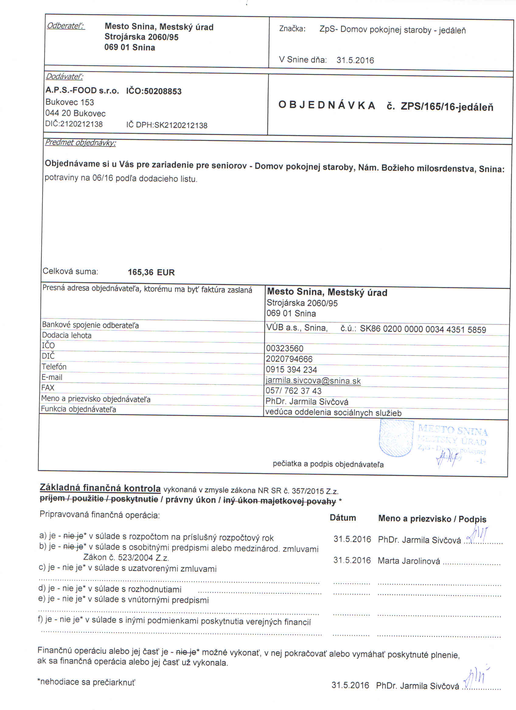 Detail objednávky ZPS/165/16-jedáleň