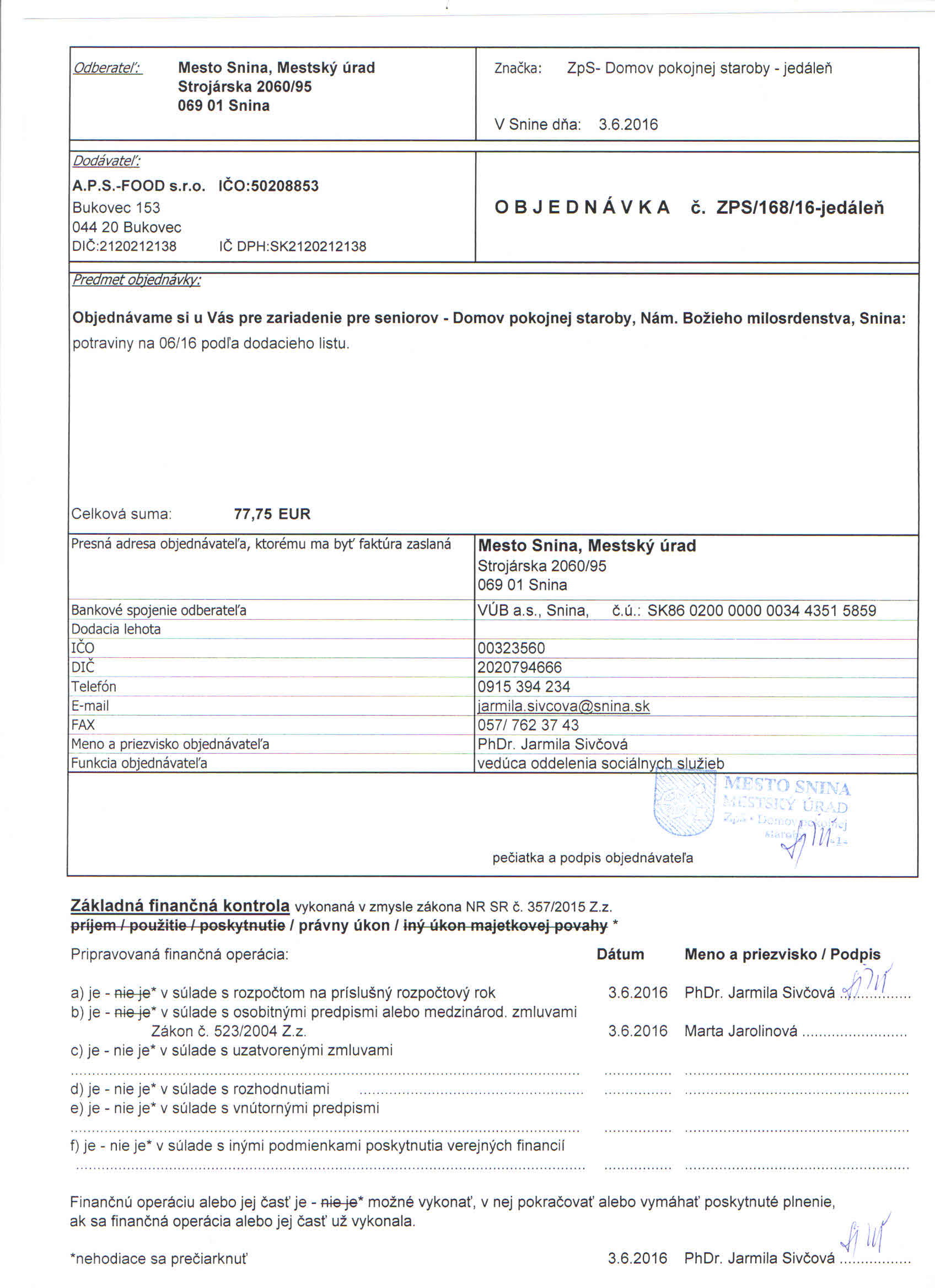 Detail objednávky ZPS/168/16-jedáleň