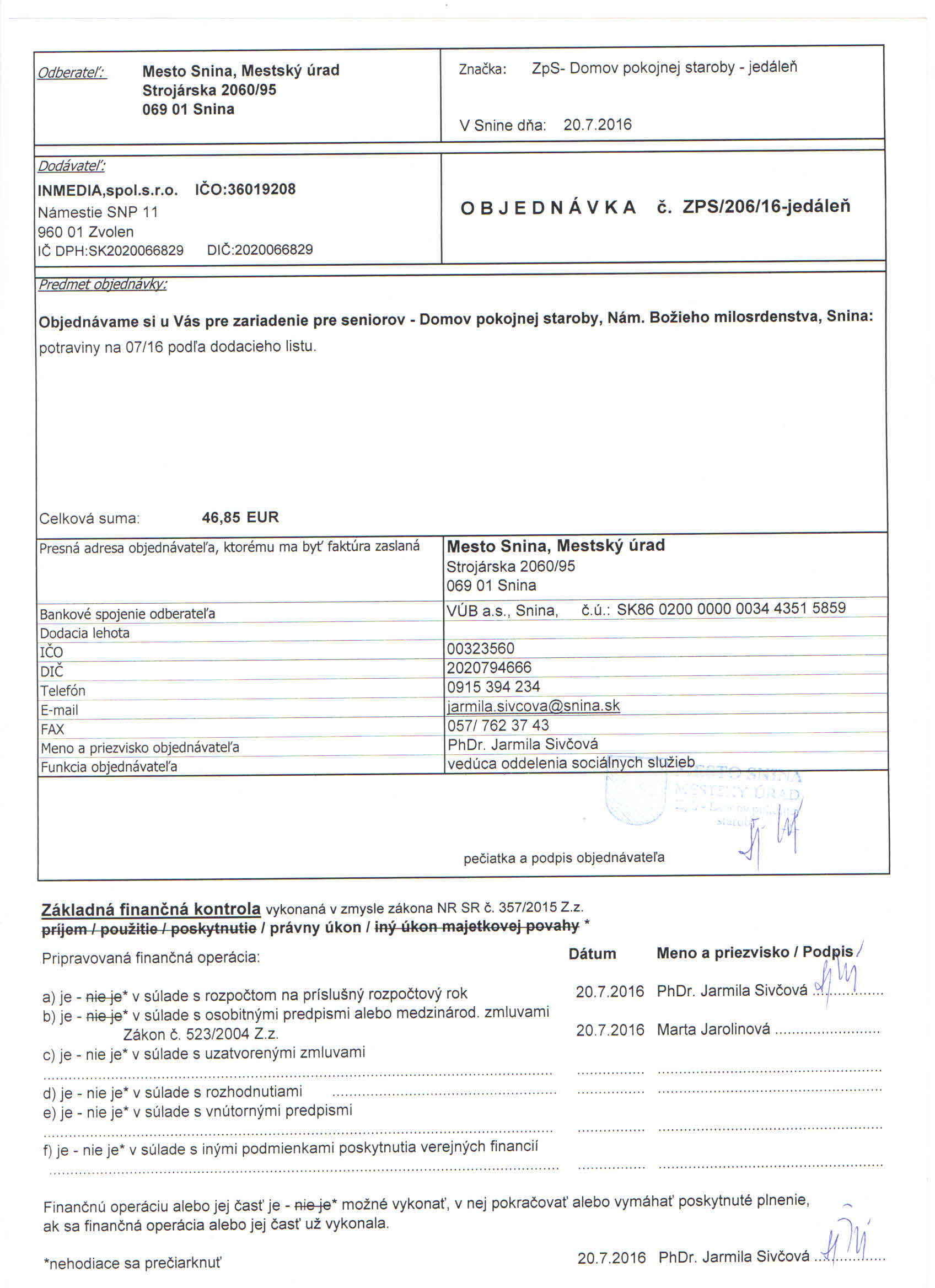 Detail objednávky ZPS/206/16-jedáleň