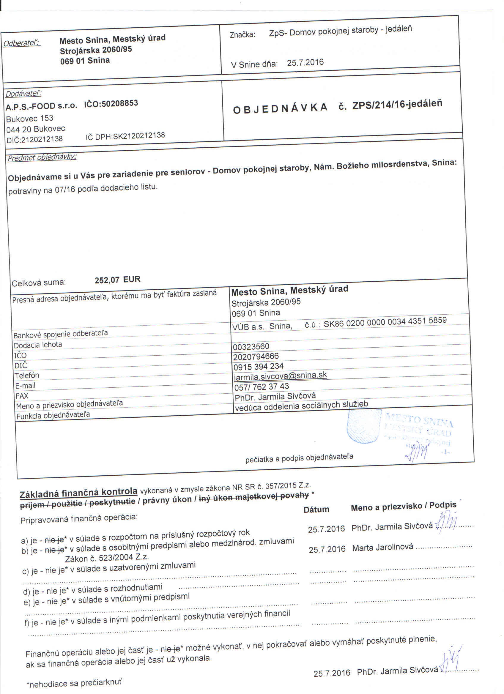Detail objednávky ZPS/214/16-jedáleň