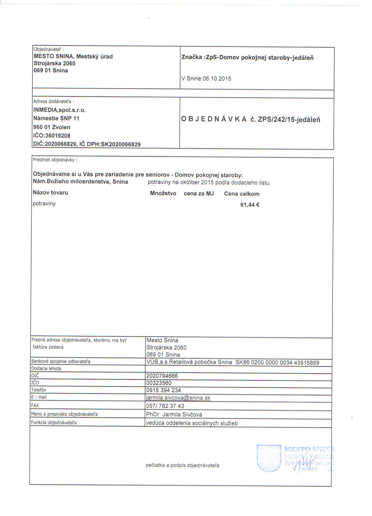 - Mesto Snina, Mestský úrad, Strojárska 2060/95, 069 01 Snin