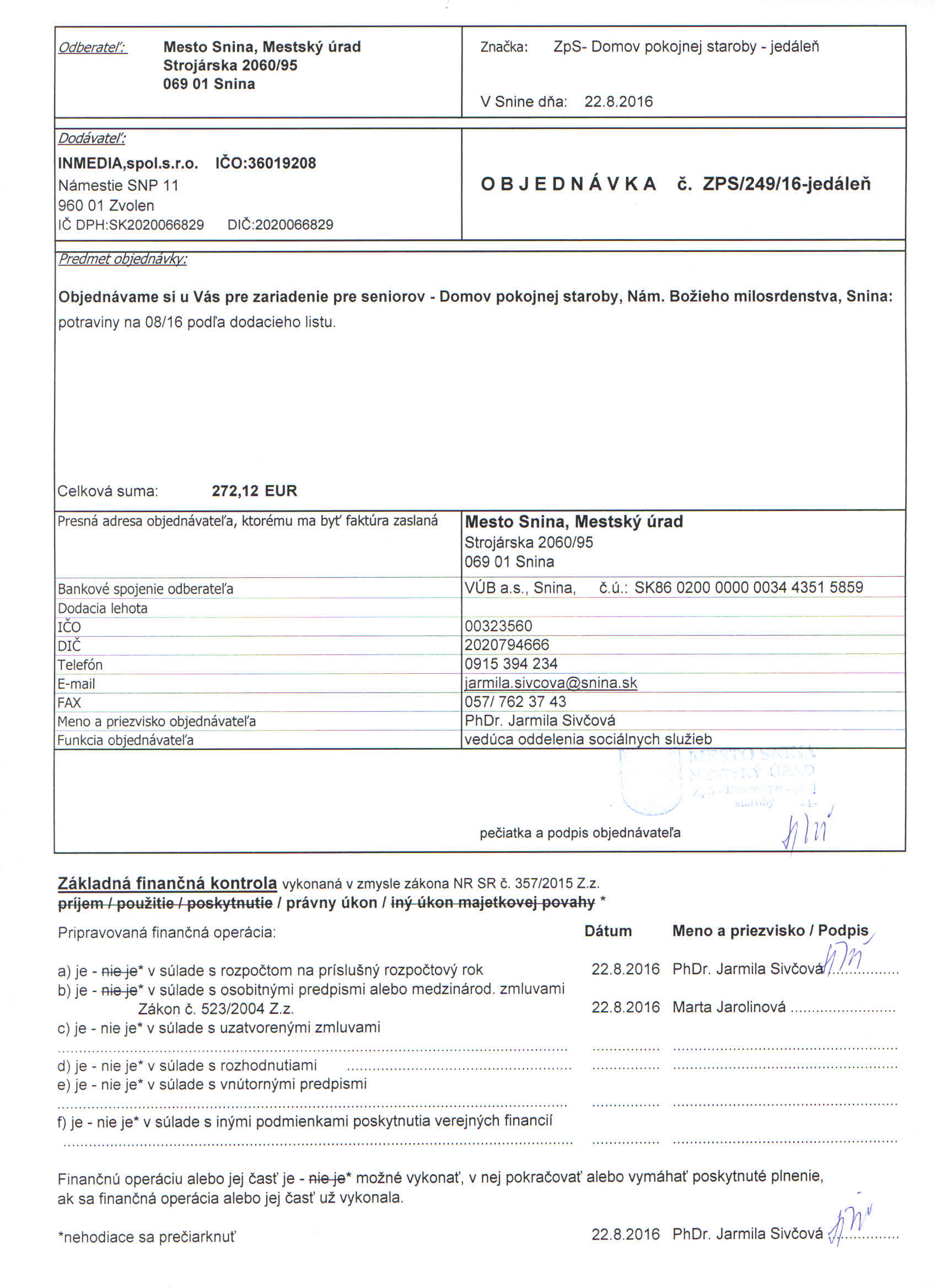 Detail objednávky ZPS/249/16-jedáleň