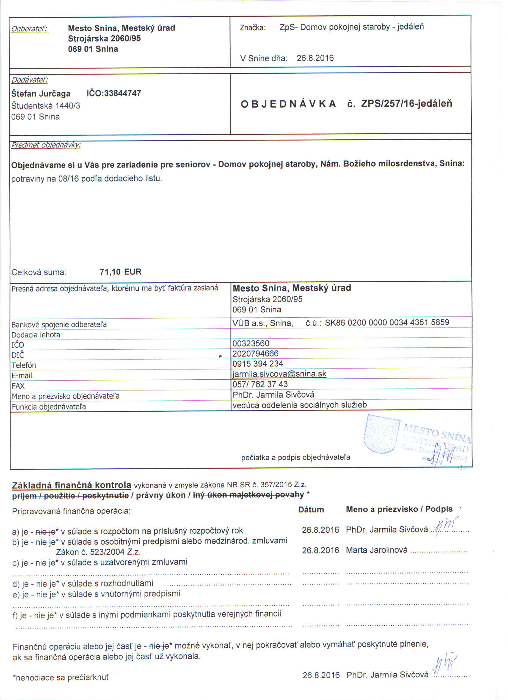 Detail objednávky ZPS/257/16-jedáleň
