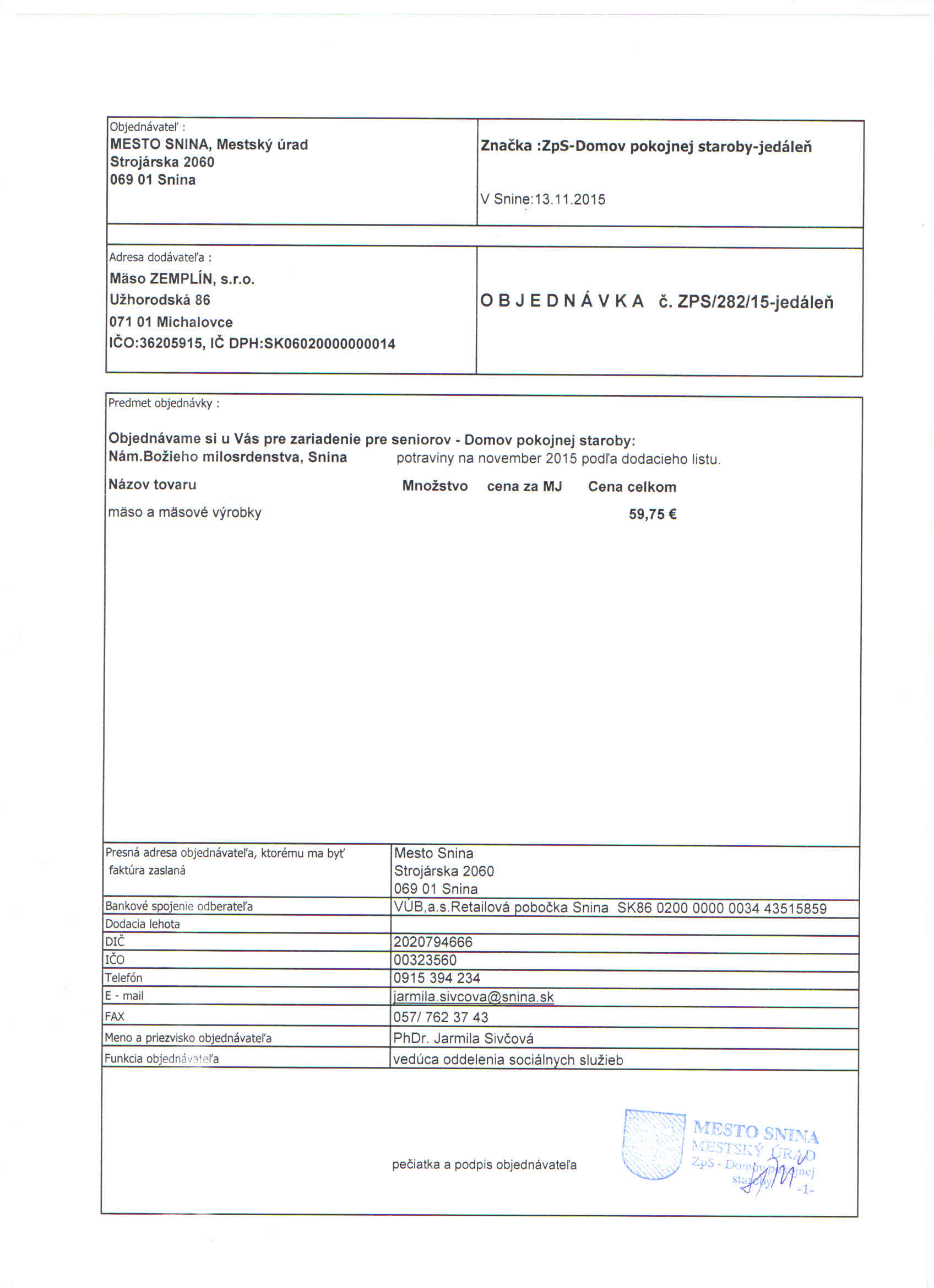 - Mesto Snina, Mestský úrad, Strojárska 2060/95, 069 01 Snin