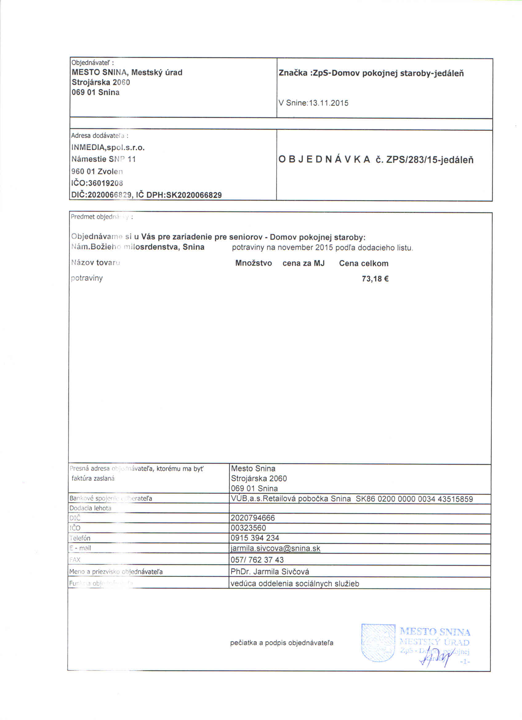 - Mesto Snina, Mestský úrad, Strojárska 2060/95, 069 01 Snin