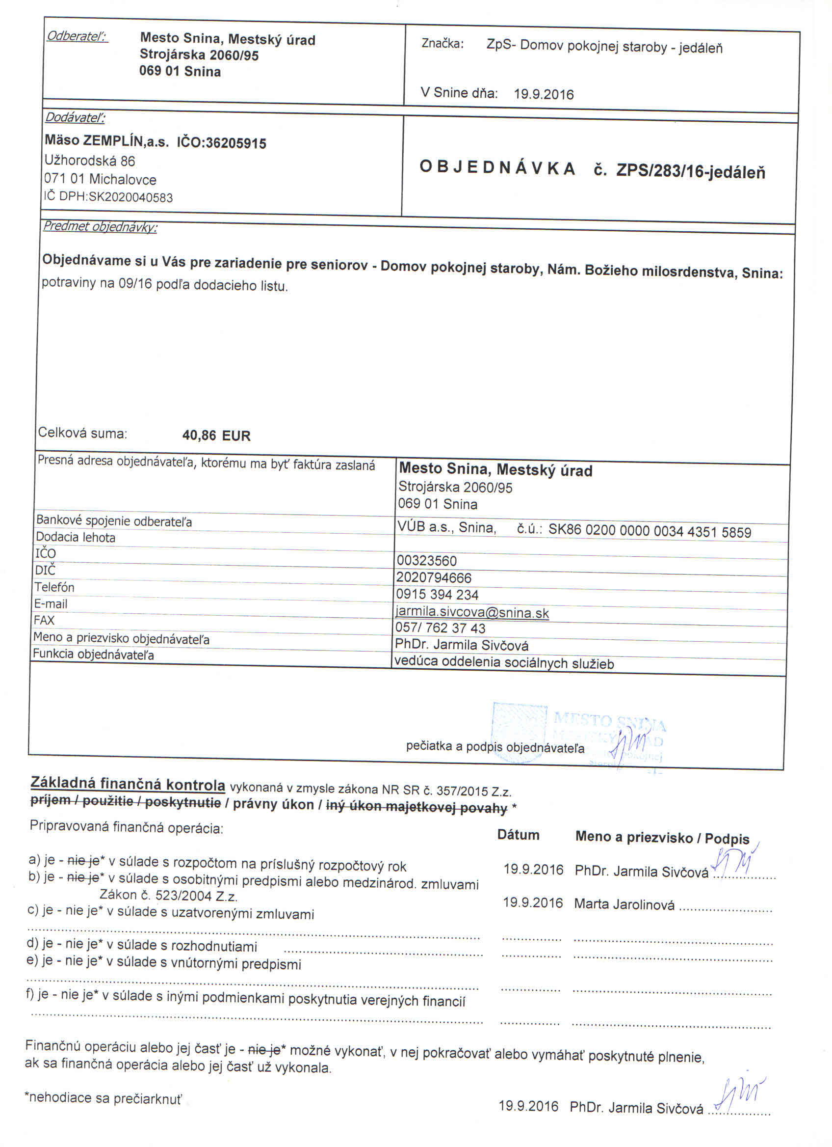 Detail objednávky ZPS/283/16-jedáleň