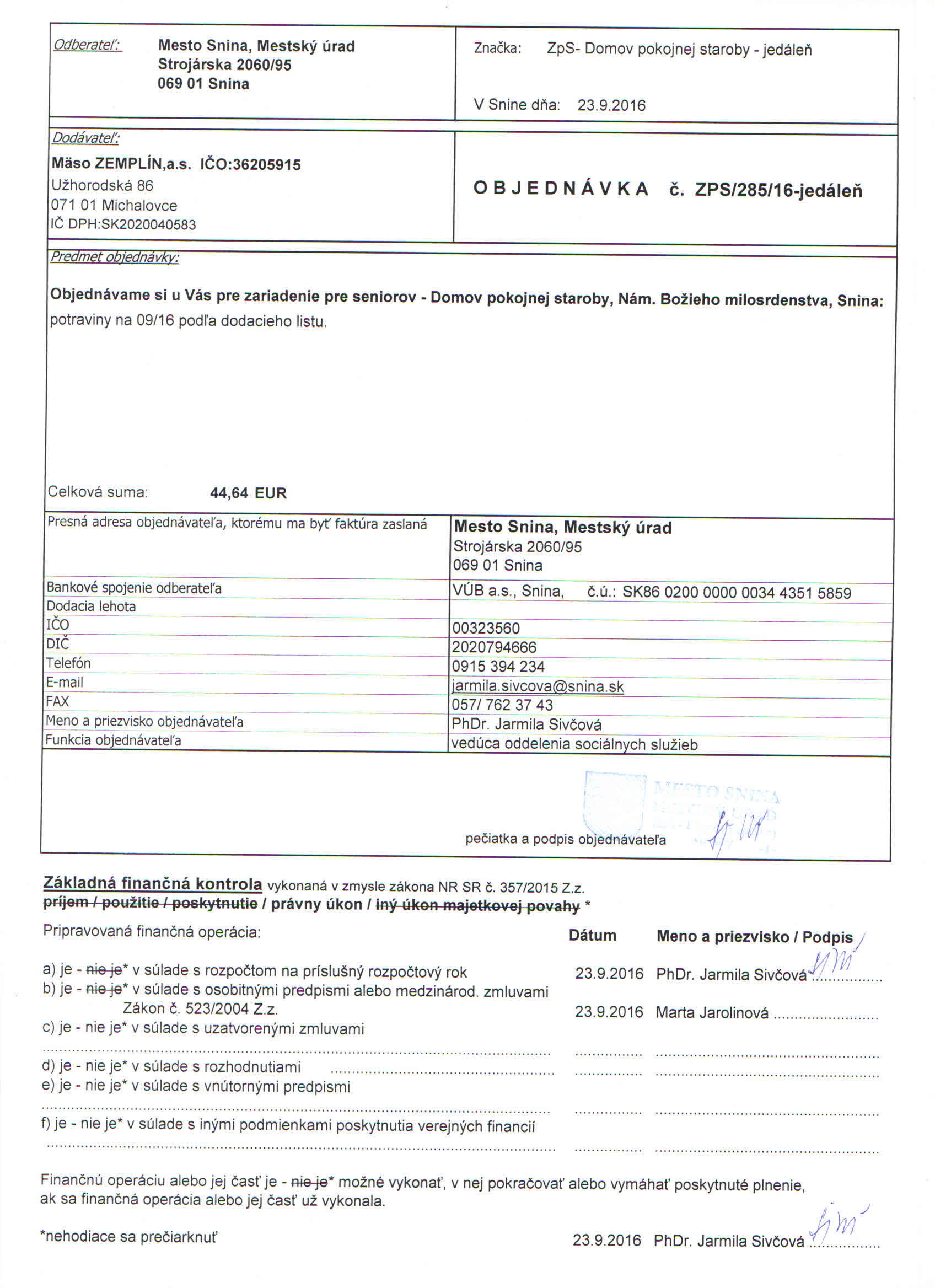 Detail objednávky ZPS/285/16-jedáleň