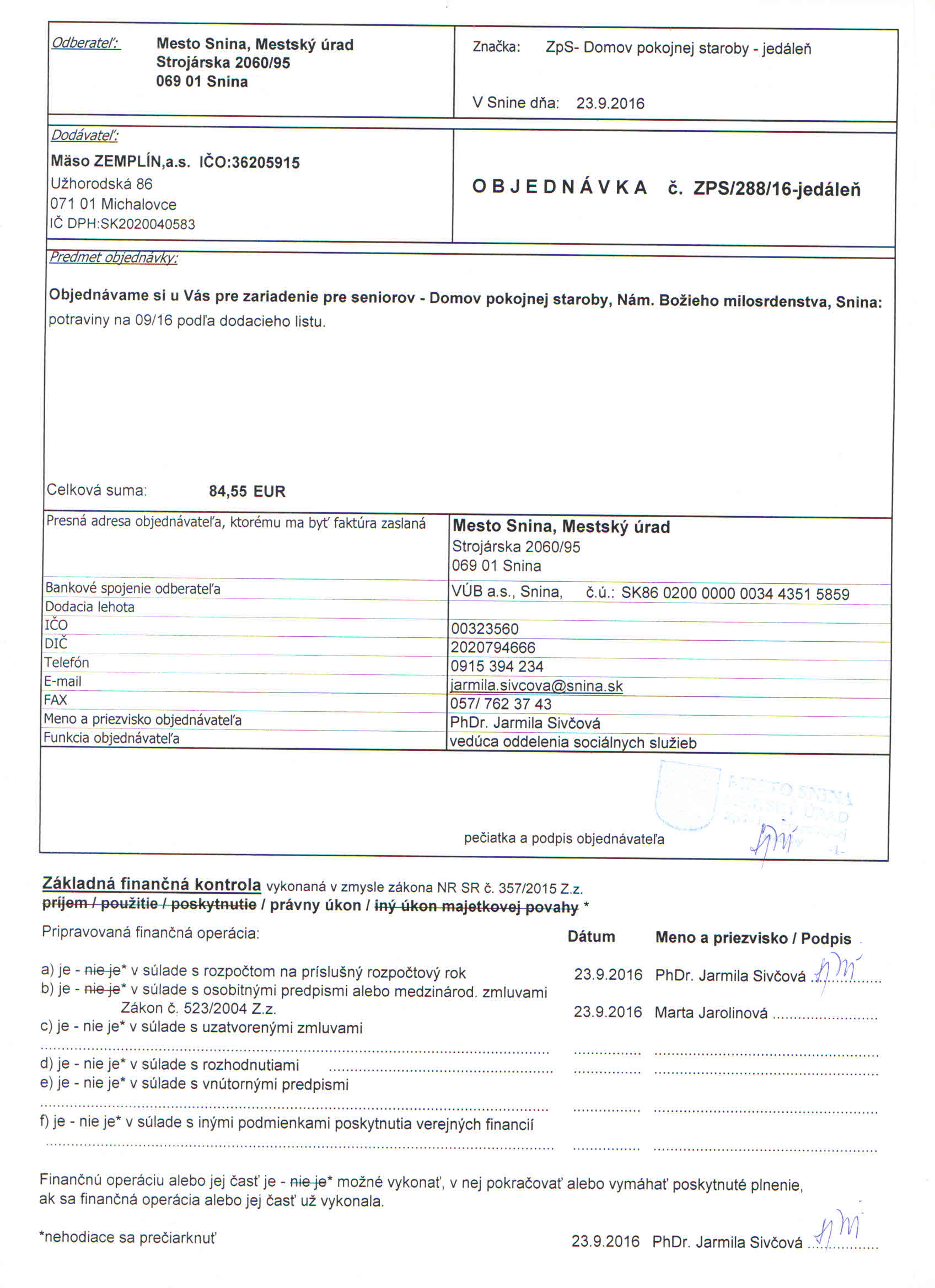 Detail objednávky ZPS/288/16-jedáleň