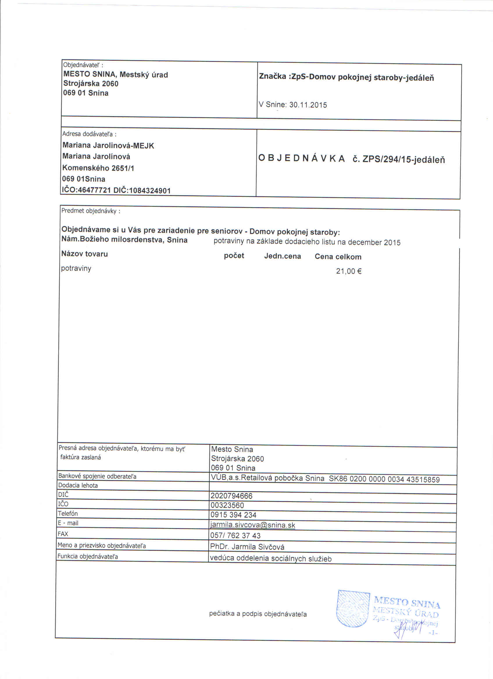Detail objednávky ZPS/294/15-jedáleň