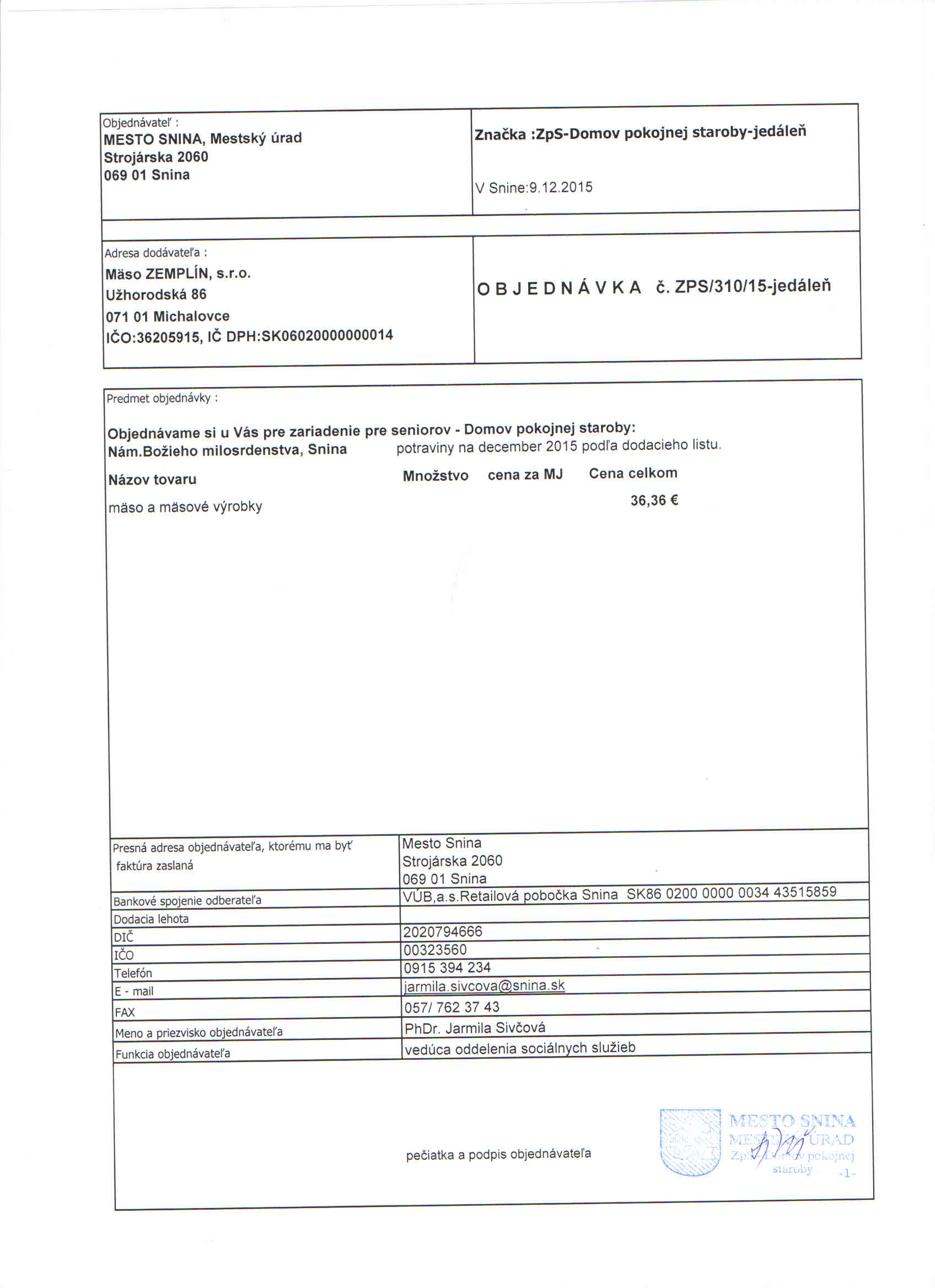 - Mesto Snina, Mestský úrad, Strojárska 2060/95, 069 01 Snin