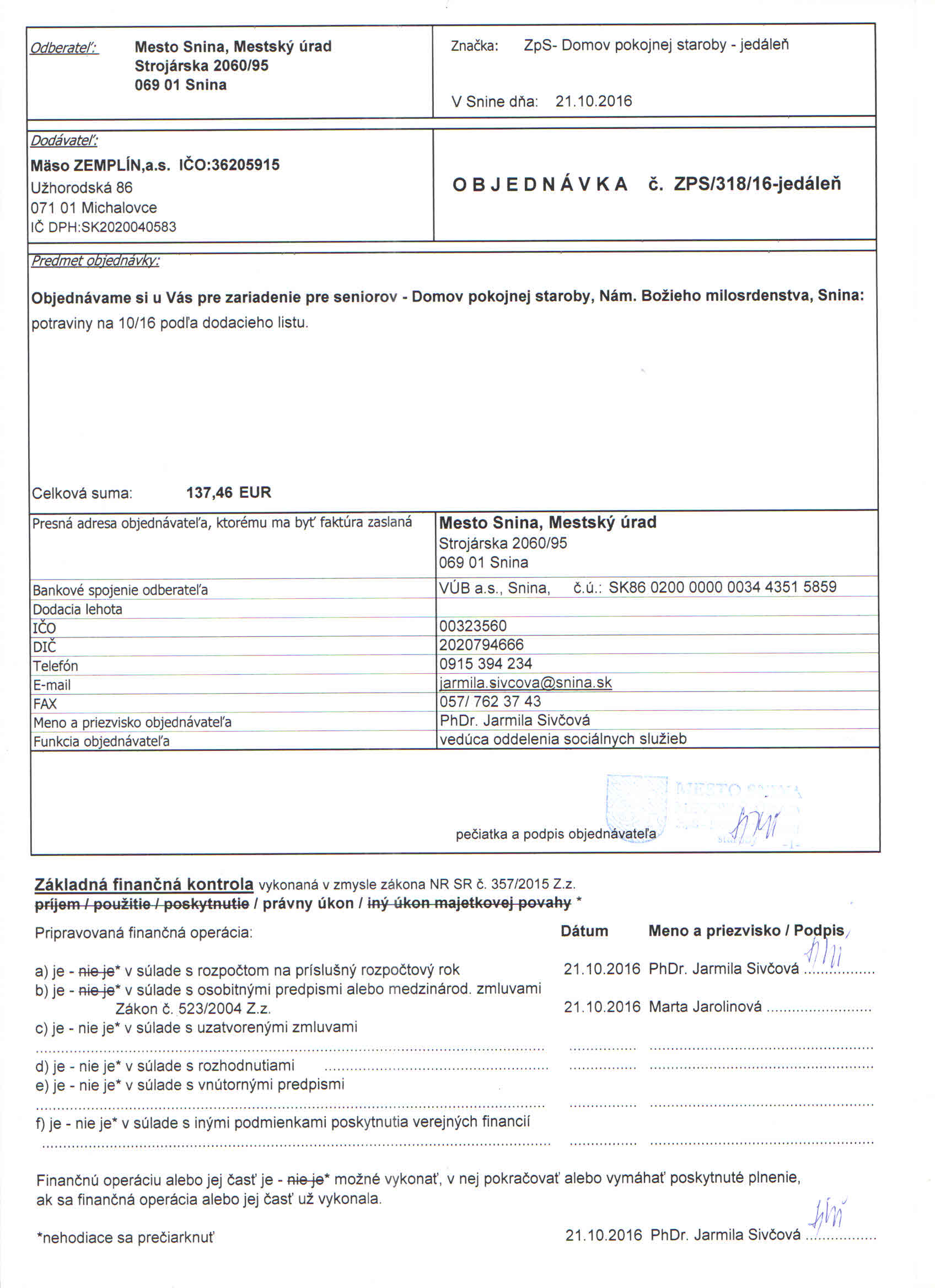Detail objednávky ZPS/318/16-jedáleň