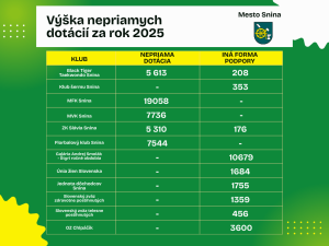 Prehľad nepriamych dotácií a ďalších foriem finančnej podpory, ktorými mesto Snina podporuje činnosť občianskych združení, športových klubov a ďalších subjektov pôsobiacich na území mesta.