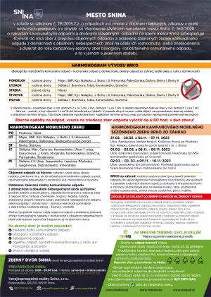 Sezónny zber biologicky rozložiteľného komunálneho odpadu (BRKO) zo záhrad bude realizovaný v častiach mesta Snina s rodinnou zástavbou.