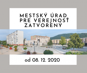 Od zajtra 8. decembra 2020 bude Mestský úrad pre verejnosť zatvorený a požiadavky občanov budú vybavované najmä telefonicky a elektronicky.