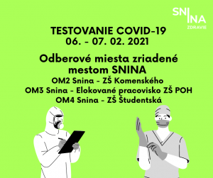 Od pondelka (8. 02. 2021) plánujeme otvoriť materské školy a od stredy (10. 02. 2021) aj 1. stupeň ZŠ v zriaďovateľskej pôsobnosti mesta. Mesto Snina preto posilní existujúce odberové miesta počas tohto víkendu, aby naši obyvatelia mali možnosť získať certifikát bez dlhého čakania.