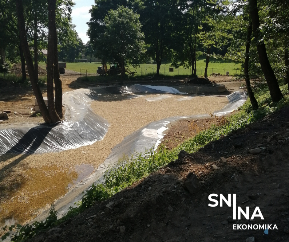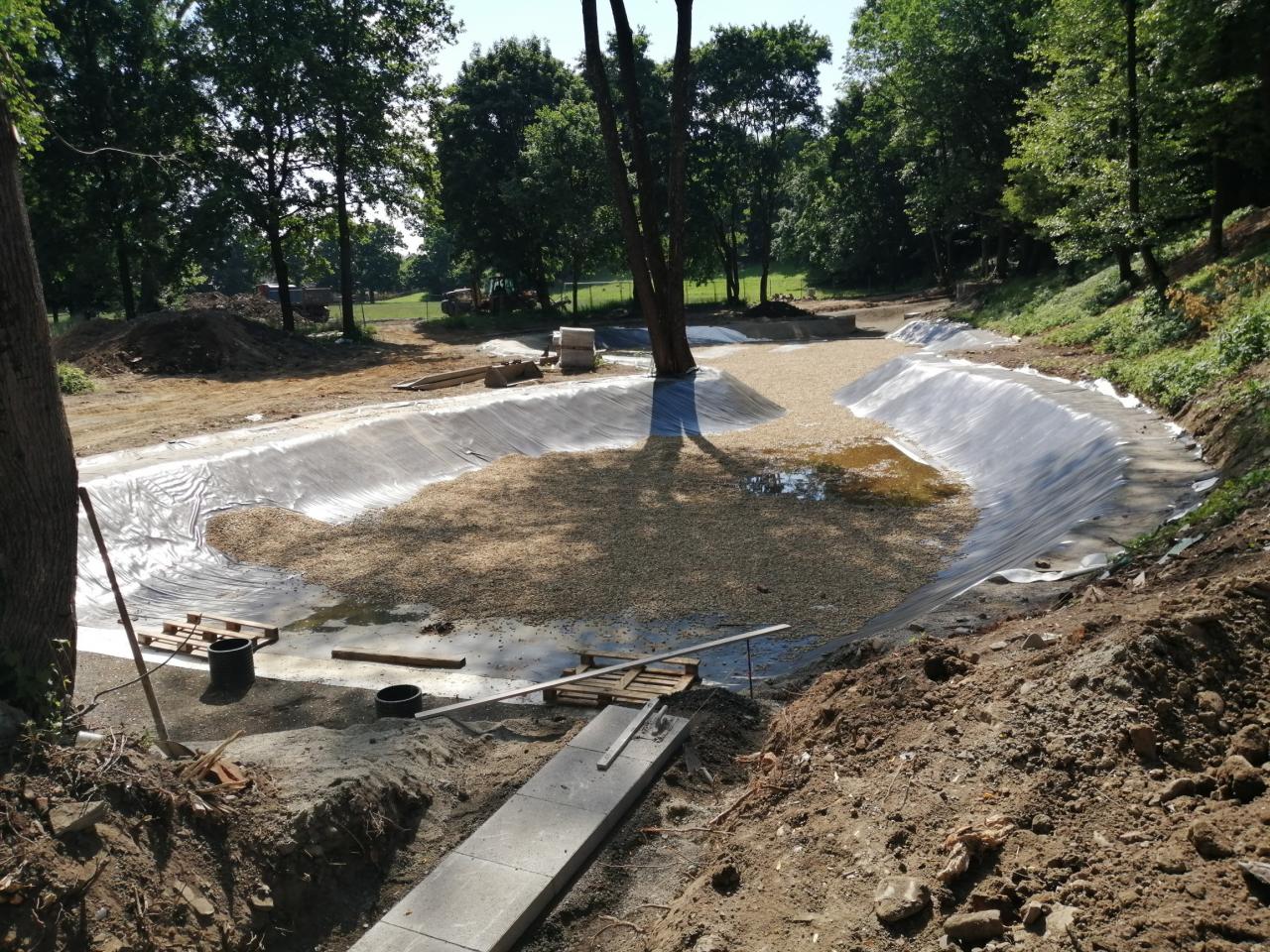 - Pokládka fólie na dno jazierka a priťaženie fólie