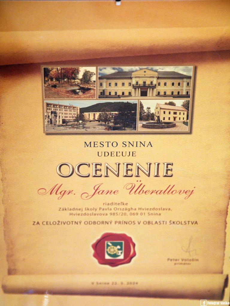 Mesto Snina v tomto školskom roku ocenilo pedagógov v dvoch kategóriách. V 1. kategórii za Osobný prínos v oblasti školstva, kde učiteľov navrhlo vedenie školy boli ocenení títo pedagogickí zamestnanci: