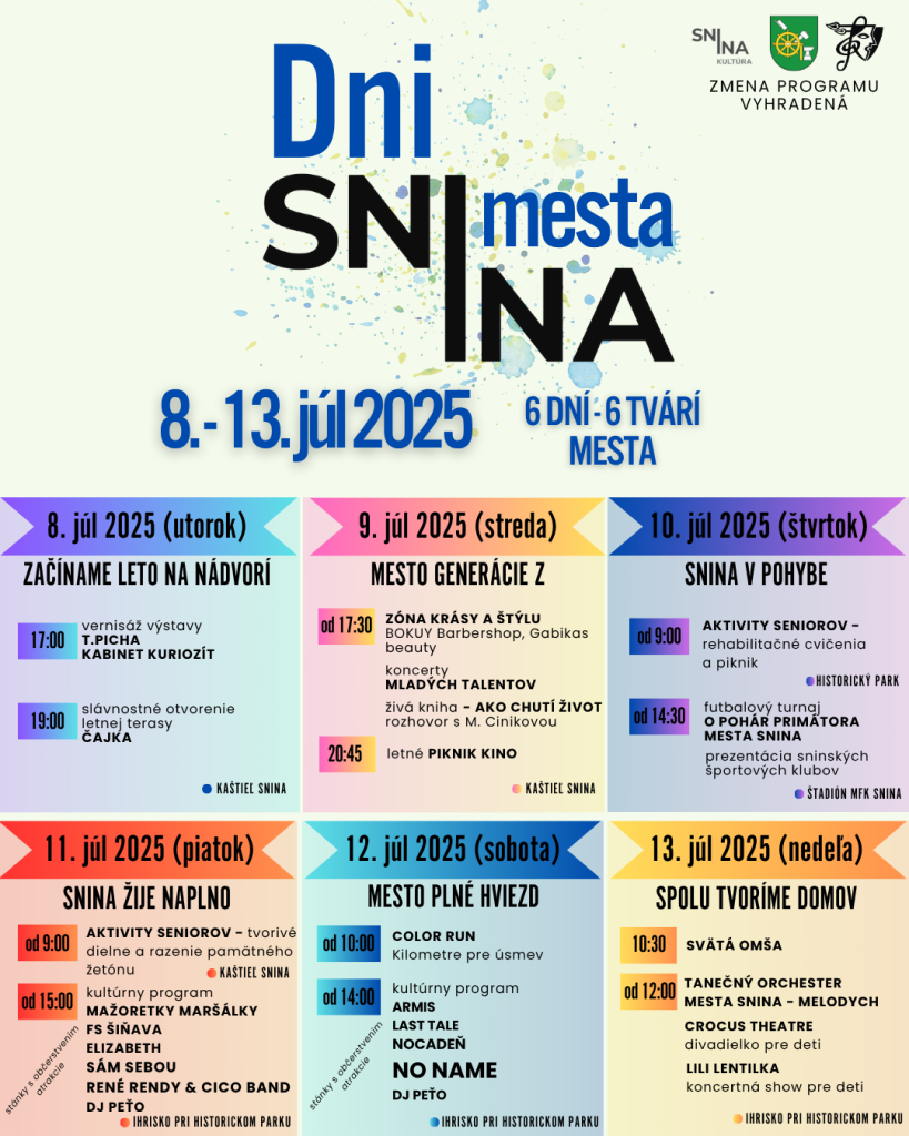 Ako sme už avizovali, tento rok prichádzame s niečím novým! Čaká nás 6 dní – 6 tvárí mesta, ktoré predstavia Sninu v rôznych podobách. Každý deň ponúkne jedinečnú atmosféru, zážitky aj aktivity, v ktorých si každý nájde to svoje – od najmenších až po seniorov.