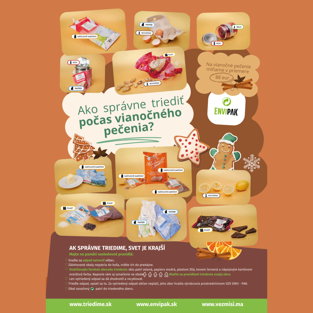 Ľudia na Slovensku sa počas Vianoc nezvyknú obmedzovať – na vianočné pečenie míňame v priemere 88 eur. Odborníci sa zhodujú v tom, že dôležitejšie ako množstvo koláčov, je ich kvalita a pestrosť chutí. Okrem radosti z vianočného pečenia ale netreba zabúdať ani na vytriedenie odpadu, ktorý počas tejto činnosti vzniká. „Vianočné pečenie prináša so sebou aj odpad, a to nielen v podobe zvyškov z pečenia, ale aj obalov od surovín, ktoré pri ňom používame. Pri pečení sa odpadu jednoducho vyhnúť nedá a keď už nejaký ten odpad vznikne, tak je potrebné s ním správne naložiť,“ hovorí Katarína Kretter, riaditeľka komunikácie OZV ENVI - PAK. Samozrejme, aj v tomto prípade je potrebné vopred odhadnúť mieru, teda koľko toho dokážeme počas sviatkov zjesť, aby nedochádzalo k zbytočnému plytvaniu.