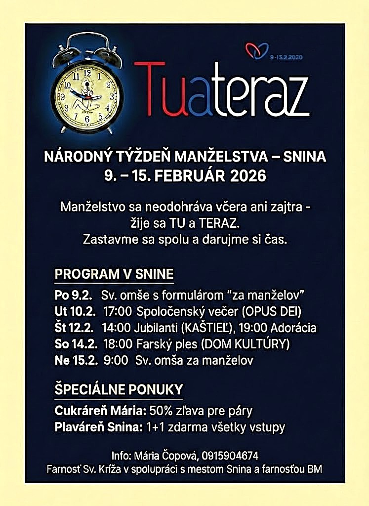 Mesto Snina v spolupráci s farnosťou Svätého Kríža Snina a farnosťou Božieho milosrdenstva vás srdečne pozývajú na Národný týždeň manželstva, ktorý sa uskutoční v termíne 9. – 15. februára 2026.