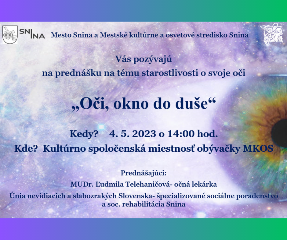 Mesto Snina a Mestské kultúrne a osvetové stredisko Snina pozývajú členov denných centier, ako aj širokú verejnosť vypočuť si rady, ako sa starať o svoje oči.