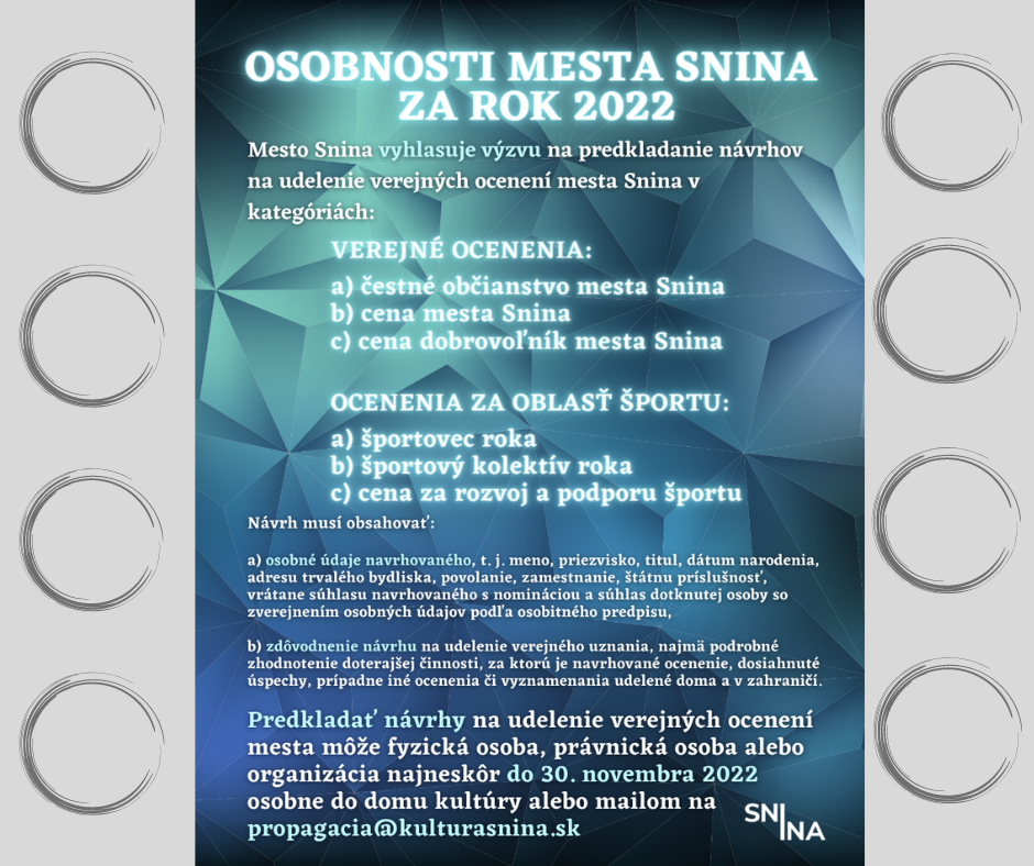 Návrhy na udelenie verejných ocenení mesta môže predkladať fyzická osoba, právnická osoba alebo organizácia najneskôr do 30. novembra 2022. Ak máte "svoju" osobnosť, ktorú chcete podporiť, neváhajte a dajte jej svoj hlas.