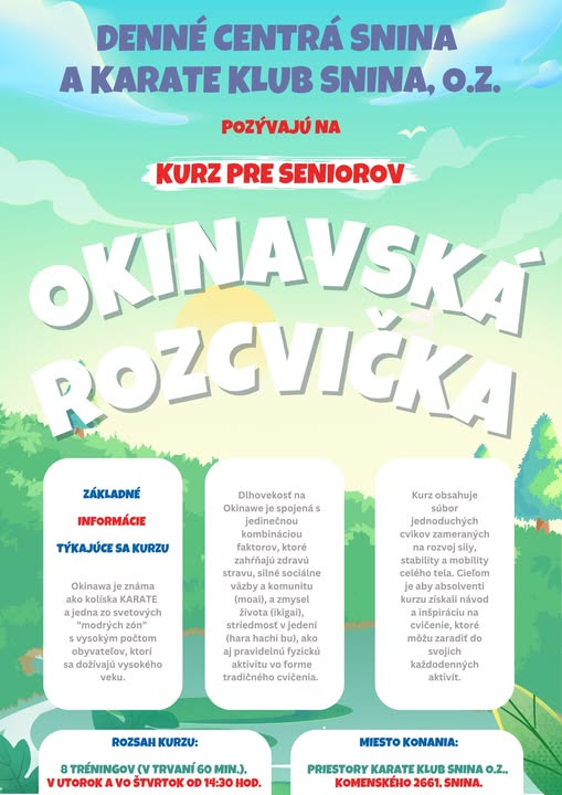 Denné centrá Snina a Karate klub Snina pripravili pre všetkých, ktorí chcú spraviť niečo pre svoje zdravie a vitalitu, pravidelné cvičenia inšpirované dlhovekosťou z ostrova Okinava.