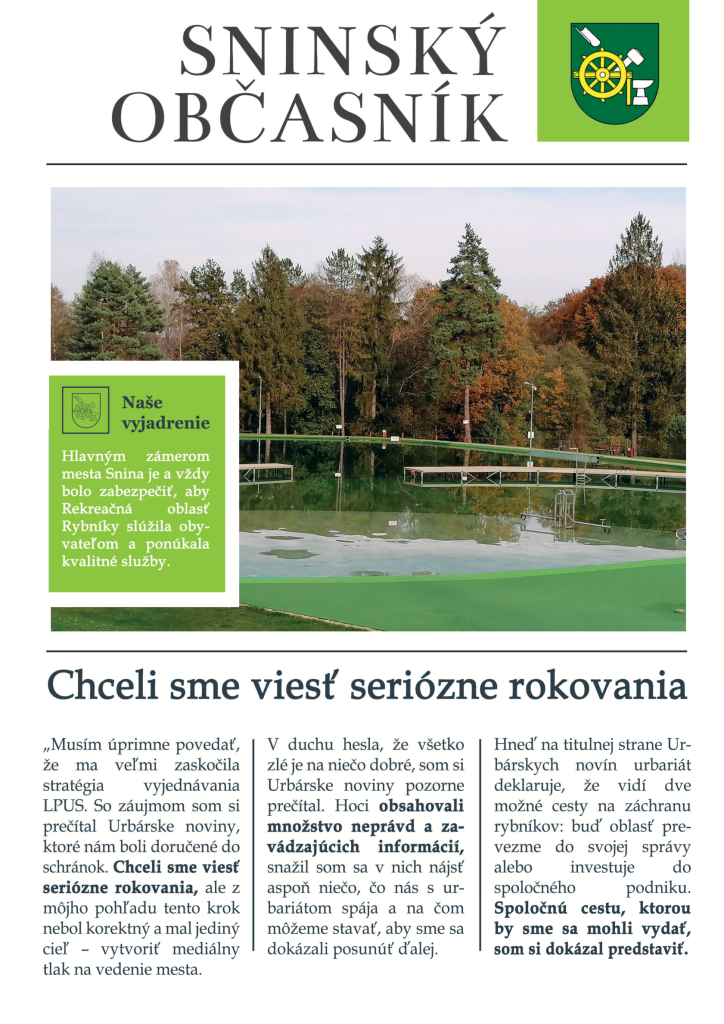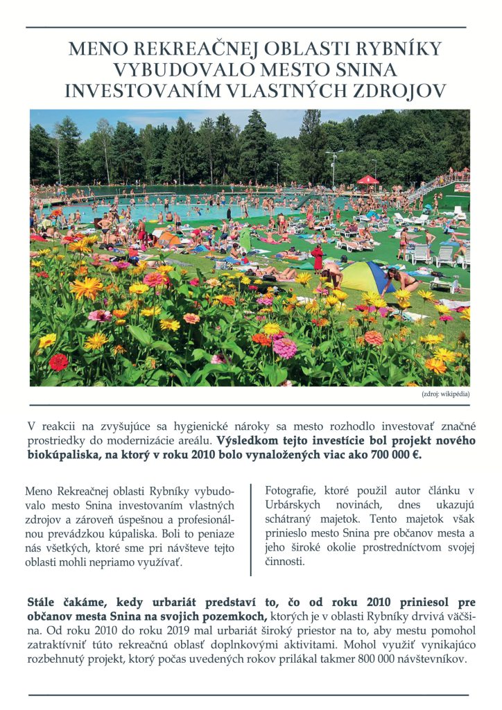 Meno Rekreačnej oblasti Rybníky vybudovalo mesto Snina investovaním vlastných zdrojov a zároveň úspešnou a profesionálnou prevádzkou kúpaliska. Boli to peniaze nás všetkých, ktoré sme pri návšteve tejto oblasti mohli nepriamo využívať. Fotografie, ktoré použil autor článku v Urbárskych novinách, dnes ukazujú schátraný majetok. Tento majetok však prinieslo mesto Snina pre občanov mesta a jeho široké okolie prostredníctvom svojej činnosti.