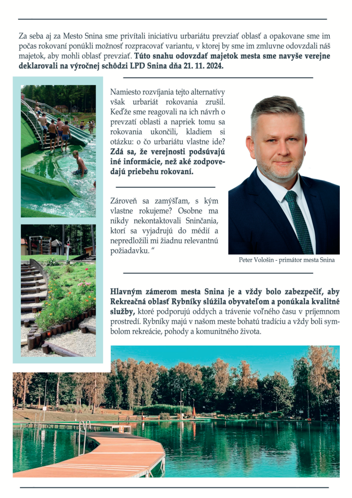 Hneď na titulnej strane Urbárskych novín urbariát deklaruje, že vidí dve možné cesty na záchranu rybníkov: buď oblasť prevezme do svojej správy alebo investuje do spoločného podniku. Spoločnú cestu, ktorou by sme sa mohli vydať, som si dokázal predstaviť. Za seba aj za Mesto Snina sme privítali iniciatívu urbariátu prevziať oblasť a opakovane sme im počas rokovaní ponúkli možnosť rozpracovať variantu, v ktorej by sme im zmluvne odovzdali náš majetok, aby mohli oblasť prevziať. Túto snahu odovzdať majetok mesta sme navyše verejne deklarovali na výročnej schôdzi LPD Snina dňa 21. 11. 2024. Namiesto rozvíjania tejto alternatívy však urbariát rokovania zrušil. Keďže sme reagovali na ich návrh o prevzatí oblasti a napriek tomu sa rokovania ukončili, kladiem si otázku: o čo urbariátu vlastne ide? Zdá sa, že verejnosti podsúvajú iné informácie, než aké zodpovedajú priebehu rokovaní. Zároveň sa zamýšľam, s kým vlastne rokujeme. Osobne ma nikdy nekontaktovali Sninčania, ktorí sa vyjadrujú do médií, a nepredložili mi žiadnu relevantnú požiadavku." Peter Vološin, primátor mesta Snina