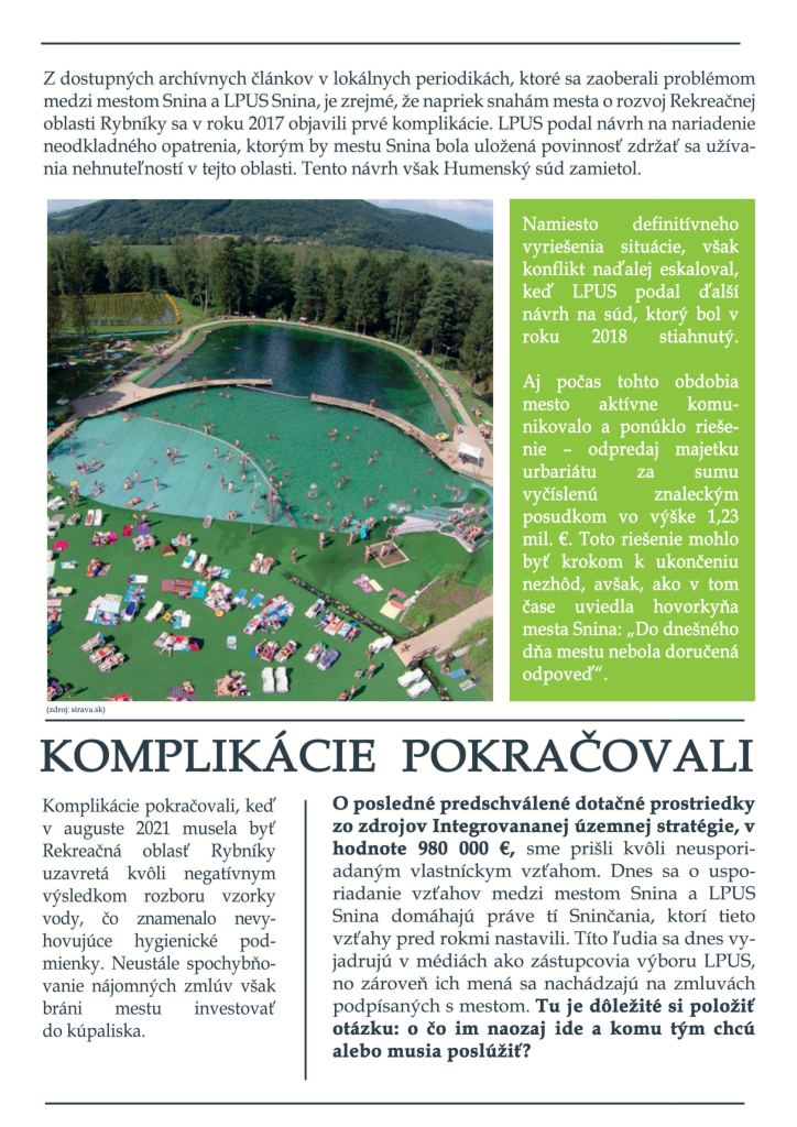 Komplikácie pokračovali, keď v auguste 2021 musela byť Rekreačná oblasť Rybníky uzavretá kvôli negatívnym výsledkom rozboru vzorky vody, čo znamenalo nevyhovujúce hygienické podmienky. Neustále spochybňovanie nájomných zmlúv však bráni mestu investovať do kúpaliska. O posledné predschválené dotačné prostriedky zo zdrojov Integrovananej územnej stratégie, v hodnote 980 000 €, sme prišli kvôli neusporiadaným vlastníckym vzťahom. Dnes sa o usporiadanie vzťahov medzi mestom Snina a LPUS Snina domáhajú práve tí Sninčania, ktorí tieto vzťahy pred rokmi nastavili. Títo ľudia sa dnes vyjadrujú v médiách ako zástupcovia výboru LPUS, no zároveň ich mená sa nachádzajú na zmluvách podpísaných s mestom. Tu je dôležité si položiť otázku: o čo im naozaj ide a komu tým chcú alebo musia poslúžiť?